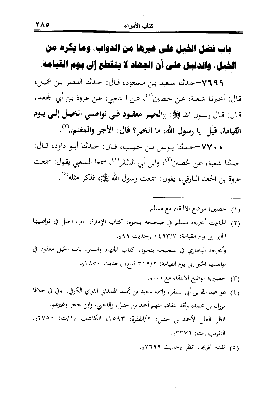 7699 - حدثنا سعيد بن مسعود، قال: حدثنا النضر بن شهيل، قال: أخبرنا شعبة، عن حصين (¬1)، عن الشعبي، عن عروة بن أبي الجعد، قال: قال رسول الله -صلى الله عليه وسلم-: "الخير معقود في نواصي الخيل إلى يوم القيامة، قيل: يا رسول الله، ما الخير؟ قال: الأجر والمغنم" (¬2).