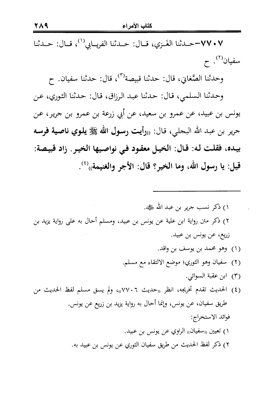 وحدثنا السلمي، قال: حدثنا عبد الرزاق، قال: حدثنا الثوري، عن يونس بن عبيد، عن عمرو بن سعيد، عن أبي زرعة بن عمرو بن جرير، عن جرير بن عبد الله البجلي، قال: "رأيت رسول الله -صلى الله عليه وسلم- يلوي ناصية فرسه بيده، فقلت له: قال: الخيل معقود في نواصيها الخير. زاد قبيصة: قيل: يا رسول الله، وما الخير؟ قال: الأجر والغنيمة" (¬4).