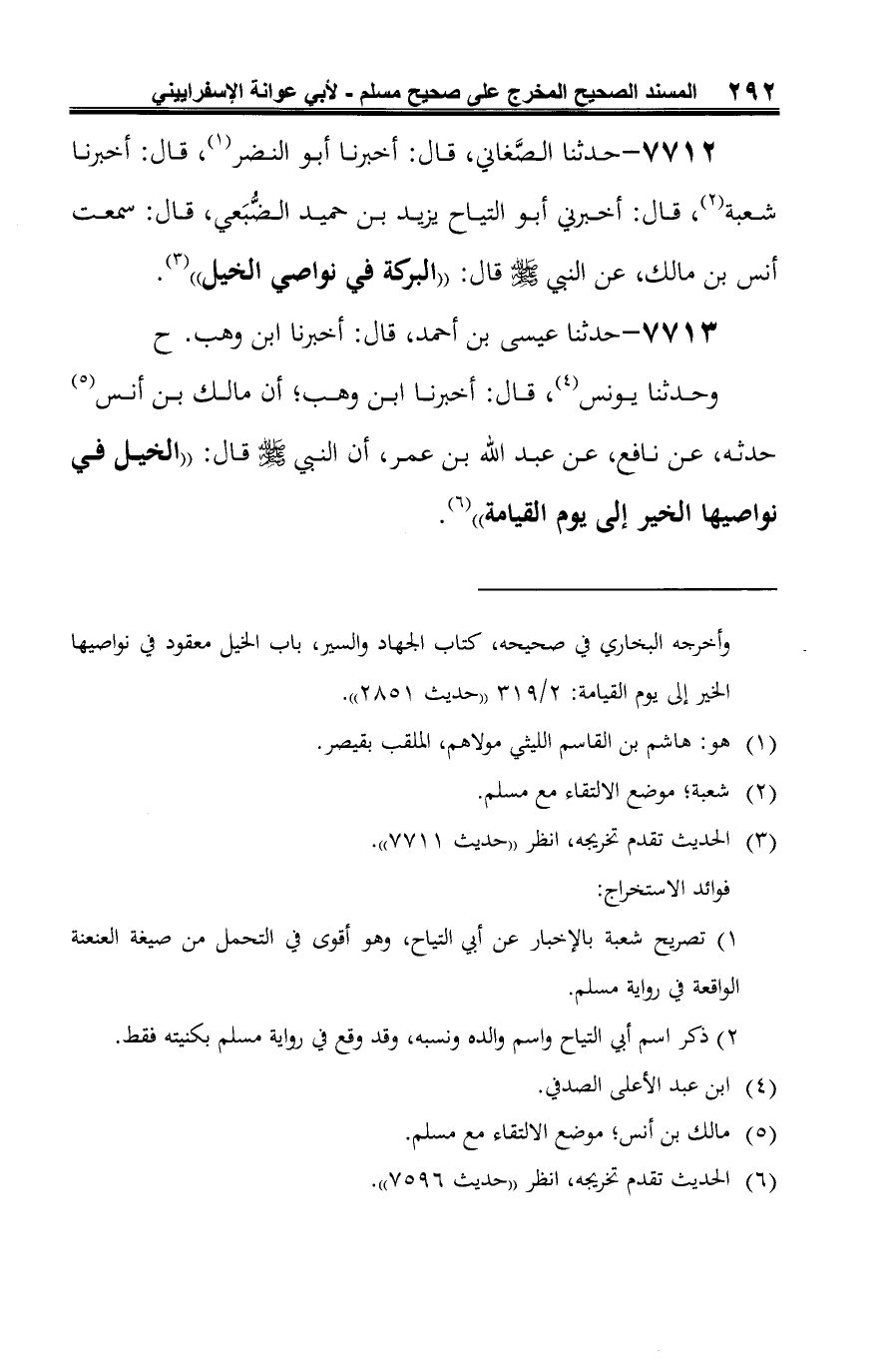 7712 - حدثنا الصَّغاني، قال: أخبرنا أبو النضر (¬1)، قال: أخبرنا شعبة (¬2)، قال: أخبرني أبو التياح يزيد بن حميد الضُّبَعي، قال: سمعت أنس بن مالك، عن النبي -صلى الله عليه وسلم- قال: "البركة في نواصي الخيل" (¬3).