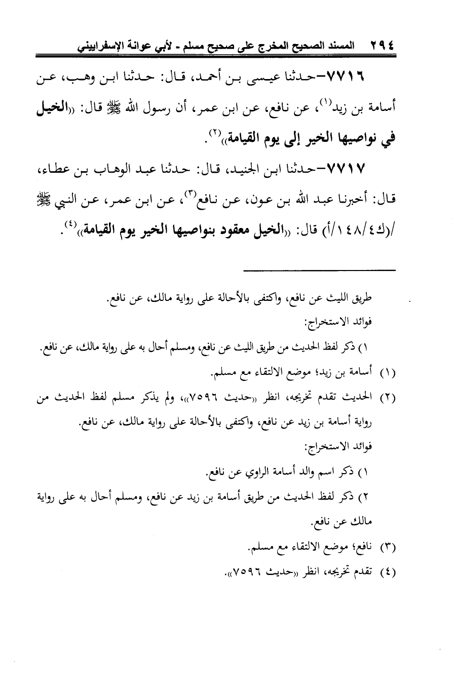 7716 - حدثنا عيسى بن أحمد، قال: حدثنا ابن وهب، عن أسامة بن زيد (¬1)، عن نافع، عن ابن عمر، أن رسول الله -صلى الله عليه وسلم- قال: "الخيل في نواصيها الخير إلى يوم القيامة" (¬2).
