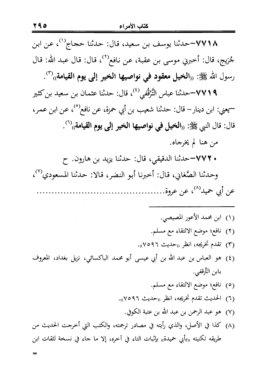 7718 - حدثنا يوسف بن سعيد، قال: حدثنا حجاج (¬1)، عن ابن جُرَيج، قال: أخبرني موسى بن عقبة، عن نافع (¬2)، قال: قال عبد الله: قال رسول الله -صلى الله عليه وسلم-: "الخيل معقود في نواصيها الخير إلى يوم القيامة" (¬3).