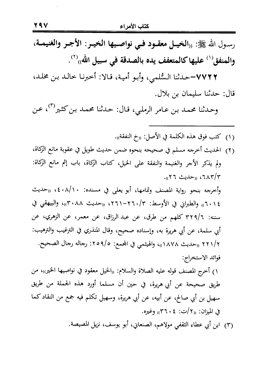-[298]- معمر، كلاهما عن سهيل (¬2)، عن أبيه، عن أبي هريرة، قال: قال -صلى الله عليه وسلم-: "الخيل معقود في نواصيها الخير إلى يوم القيامة" (¬3).