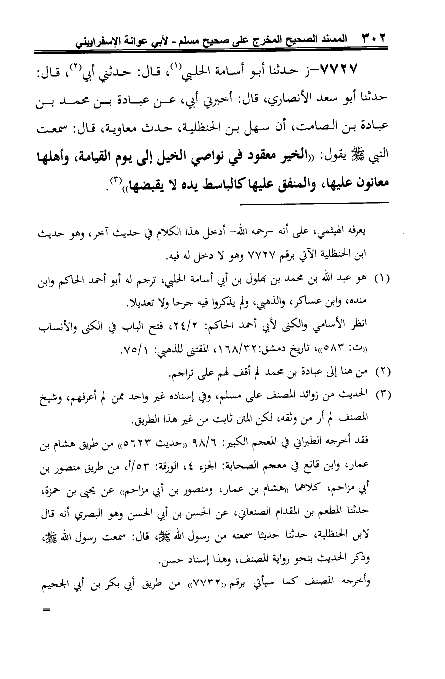 7727 - ز حدّثنا أبو أسامة الحلبي (¬1)، قال: حدثني أبي (¬2)، قال: حدّثنا أبو سعد الأنصاري، قال: أخبرني أبي، عن عبادة بن محمّد بن عبادة بن الصامت، أن سهل بن الحنظلية، حدث معاوية، قال: سمعت النَّبي -صلى الله عليه وسلم- يقول: "الخير معقود في نواصي الخيل إلى يوم القيامة، وأهلها معانون عليها، والمنفق عليها كالباسط يده لا يقبضها" (¬3).