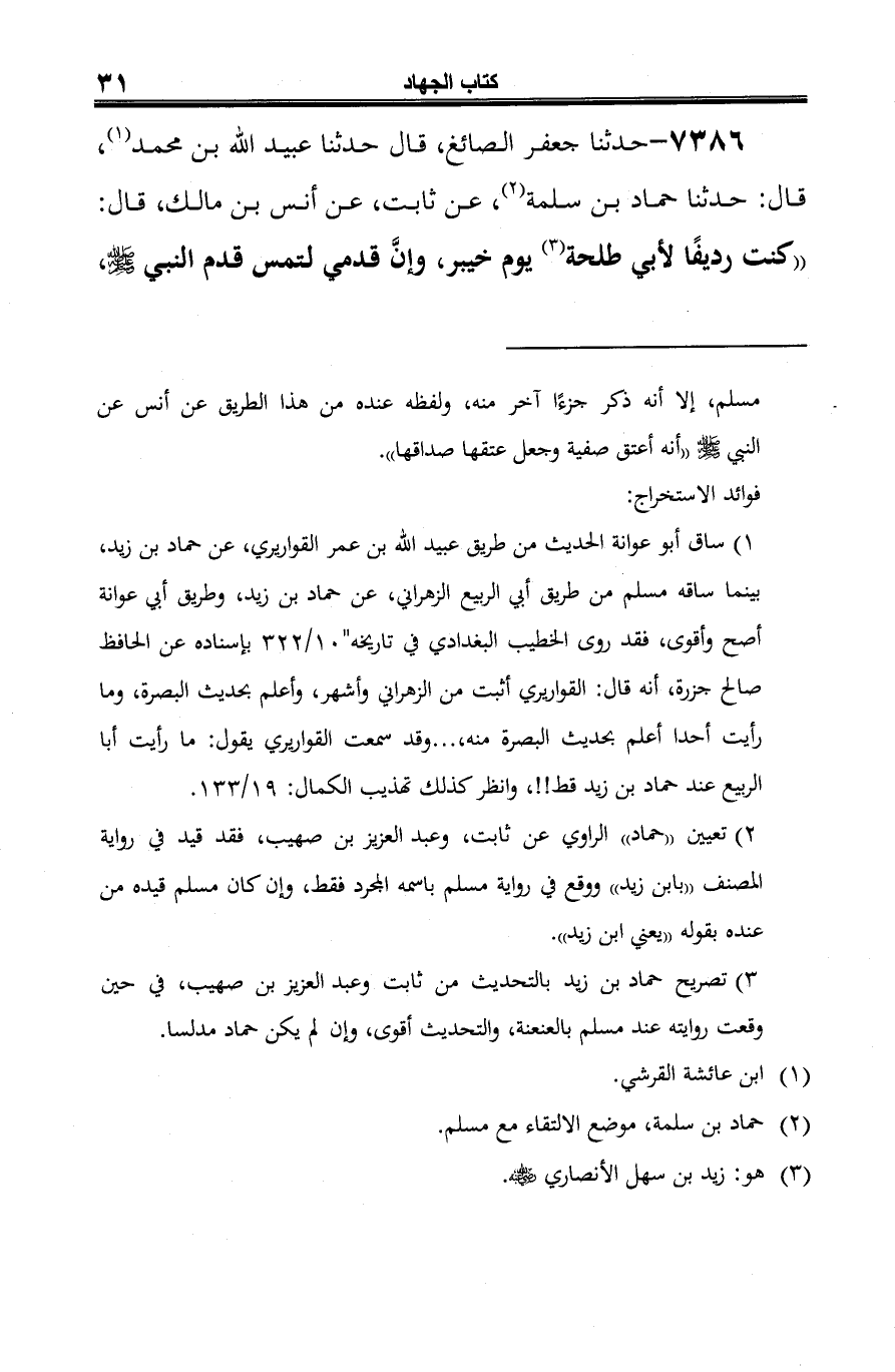 7386 - حدثنا جعفر الصائغ، قال حدثنا عبيد الله بن محمد (¬1)، قال: حدثنا حماد بن سلمة (¬2)، عن ثابت، عن أنس بن مالك، قال: "كنت رديفًا لأبي طلحة (¬3) يوم خيبر، وإنَّ قدمي لتمس قدم النبي -صلى الله عليه وسلم-،