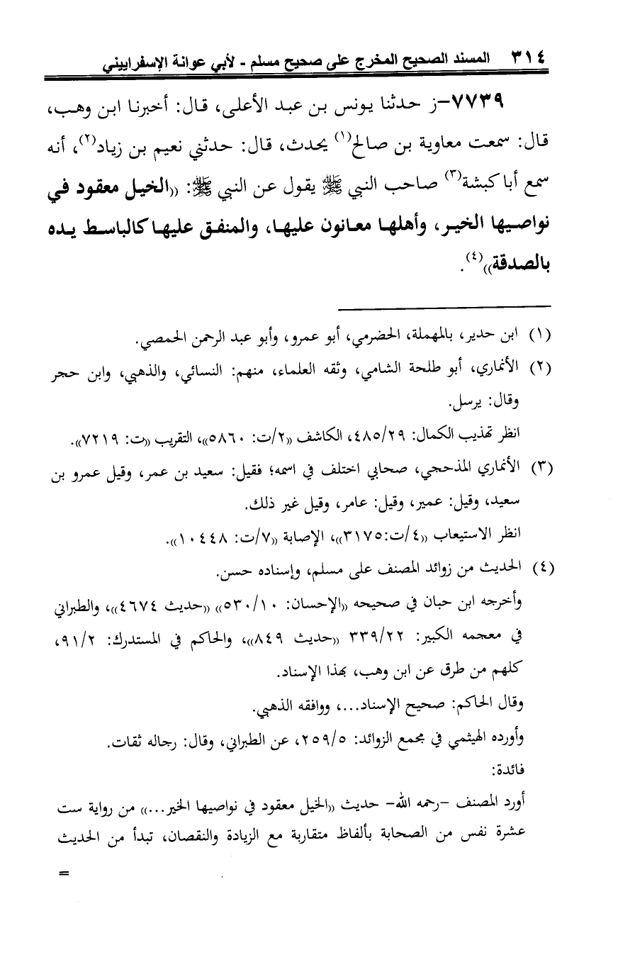 7739 - ز حدّثنا يونس بن عبد الأعلى، قال: أخبرنا ابن وهب، قال: سمعت معاوية بن صالح (¬1) يحدث، قال: حدثني نعيم بن زياد (¬2)، أنه سمع أبا كبشة (¬3) صاحب النبي -صلى الله عليه وسلم- يقول عن النبي -صلى الله عليه وسلم-: "الخيل معقود في نواصيها الخير، وأهلها معانون عليها، والمنفق عليها كالباسط يده بالصدقة" (¬4).