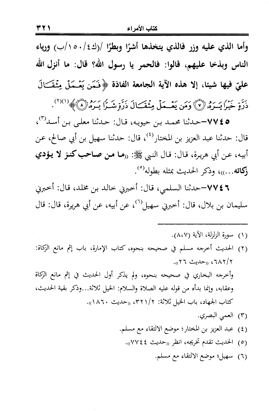 7745 - حدّثنا محمّد بن حيويه، قال: حدّثنا معلى بن أسد (¬1)، قال: حدّثنا عبد العزيز بن المختار (¬2)، قال: حدّثنا سهيل بن أبي صالح، عن أبيه، عن أبي هريرة، قال: قال النبي -صلى الله عليه وسلم-: "ما من صاحب كنز لا يؤدِّي زكاته ... "، وذكر الحديث بمثله بطوله (¬3).