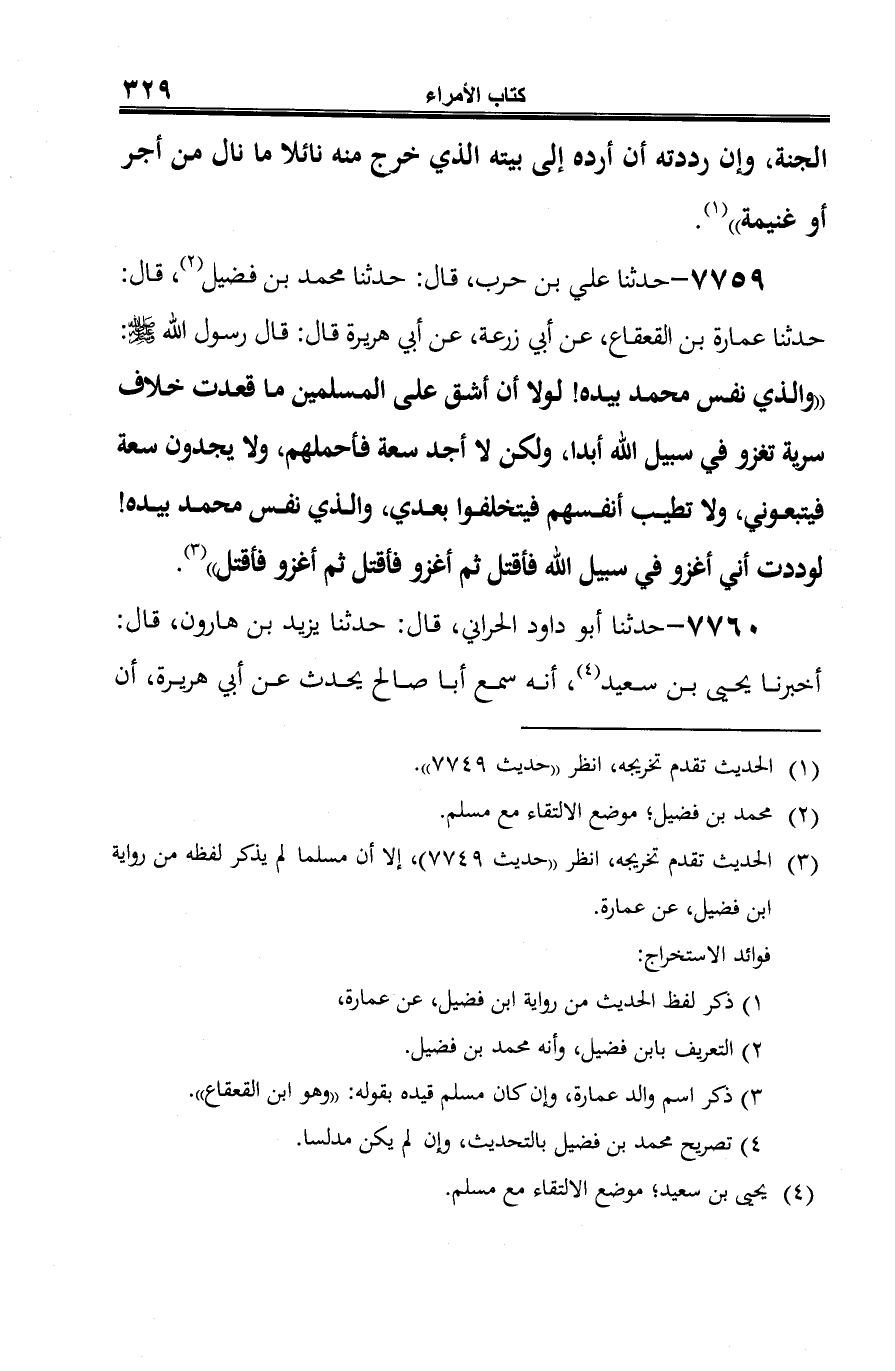 7759 - حدثنا علي بن حرب، قال: حدثنا محمّد بن فضيل (¬1)، قال: حدثنا عمارة بن القعقاع، عن أبي زرعة، عن أبي هريرة قال: قال رسول الله -صلى الله عليه وسلم-: "والذي نفس محمّد بيده! لولا أن أشق على المسلمين ما قعدت خلاف سرية تغزو في سبيل الله أبدا، ولكن لا أجد سعة فأحملهم، ولا يجدون سعة فيتبعوني، ولا تطيب أنفسهم فيتخلفوا بعدي، والذي نفس محمّد بيده! لوددت أني أغزو في سبيل الله فأقتل ثمّ أغزو فاقتل ثمّ أغزو فأقتل" (¬2).