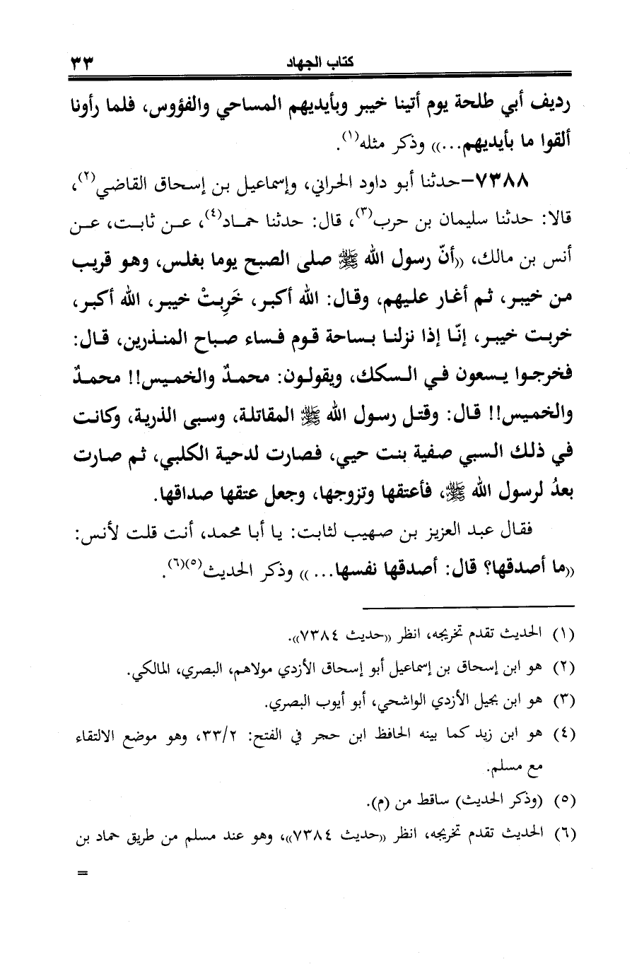 7388 - حدثنا أبو داود الحراني، وإسماعيل بن إسحاق القاضي (¬1)، قالا: حدثنا سليمان بن حرب (¬2)، قال: حدثنا حماد (¬3)، عن ثابت، عن أنس بن مالك، "أنّ رسول الله -صلى الله عليه وسلم- صلى الصبح يوما بغلس، وهو قريب من خيبر، ثم أغار عليهم، وقال: الله أكبر، خَرِبتْ خيبر، الله أكبر، خربت خيبر، إنّا إذا نزلنا بساحة قوم فساء صباح المنذرين، قال: فخرجوا يسعون في السكك، ويقولون: محمدٌ والخميس!! محمدٌ والخميس!! قال: وقتل رسول الله -صلى الله عليه وسلم- المقاتلة، وسبى الذرية، وكانت في ذلك السبي صفية بنت حيي، فصارت لدحية الكلبي، ثم صارت بعدُ لرسول الله -صلى الله عليه وسلم-، فأعتقها وتزوجها، وجعل عتقها صداقها.