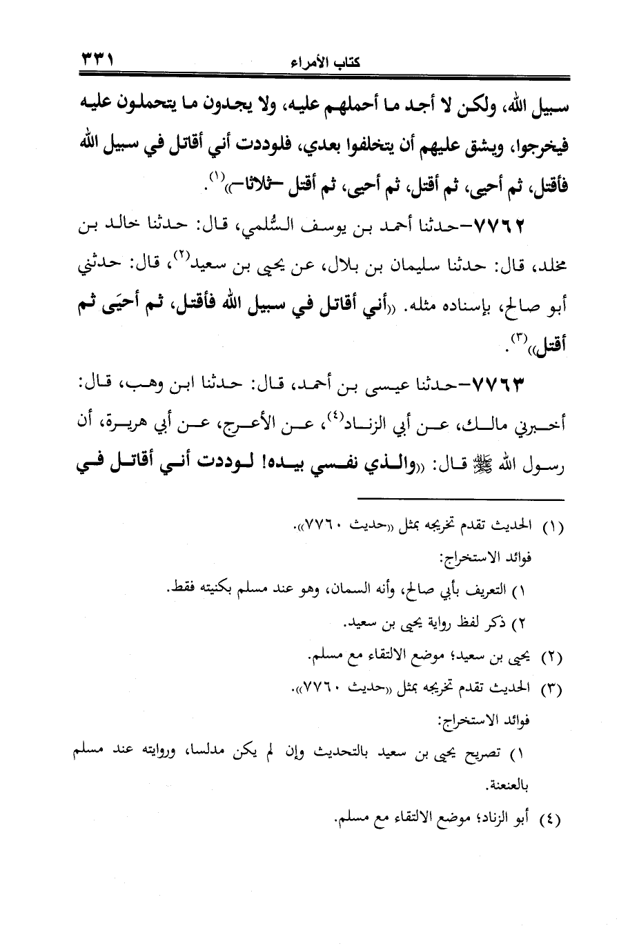 7762 - حدّثنا أحمد بن يوسف السُّلمي، قال: حدّثنا خالد بن مخلد، قال: حدّثنا سليمان بن بلال، عن يحيى بن سعيد (¬1)، قال: حدثني أبو صالح، بإسناده مثله. "أني أقاتل في سبيل الله فأقتل، ثمّ أحيَى ثمّ أقتل" (¬2).