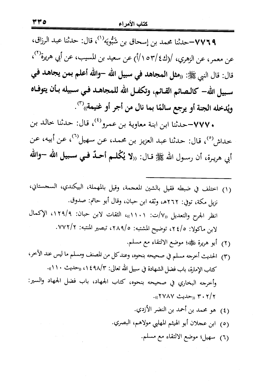 7769 - حدّثنا محمّد بن إسحاق بن شَبُّويَه (¬1)، قال: حدّثنا عبد الرزاق، عن معمر، عن الزّهريّ، عن سعيد بن المسيَّب، عن أبي هريرة (¬2)، قال: قال النبي -صلى الله عليه وسلم-: "مثل المجاهد في سبيل الله -والله أعلم بمن يجاهد في سبيل الله- كالصائم القائم، وتكفل الله للمجاهد في سبيله بأن يتوفاه ويُدخله الجنَّة أو يرجع سالمًا بما نال من أجر أو غنيمة" (¬3).
