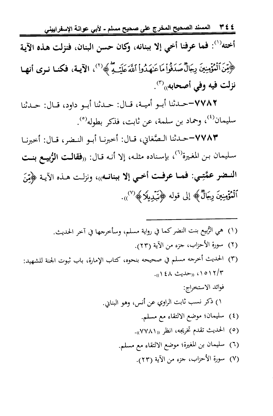 7783 - حدّثنا الصَّغاني، قال: أخبرنا أبو النضر، قال: أخبرنا سليمان بن المغيرة (¬1)، بإسناده مثله، إِلَّا أنه قال: "فقالت الرُّبيع بنت النضر عمَّتِي: فما عرفت أخي إِلَّا ببنانه"، ونزلت هذه الآية {مِنَ الْمُؤْمِنِينَ رِجَالٌ} إلى قوله {تَبْدِيلًا} (¬2) ".