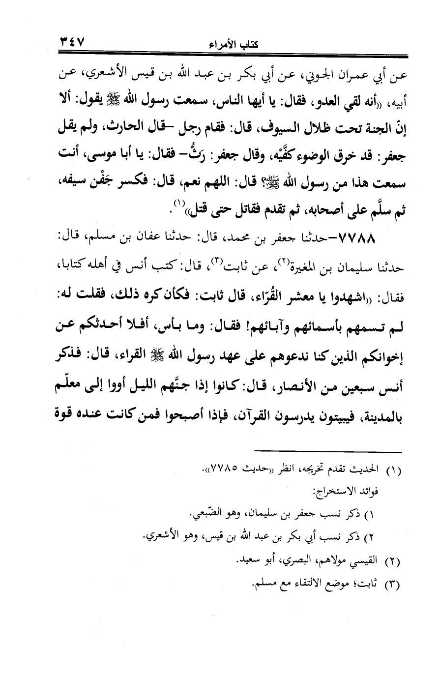 7788 - حدّثنا جعفر بن محمّد، قال: حدّثنا عفان بن مسلم، قال: حدّثنا سليمان بن المغيرة (¬1)، عن ثابت (¬2)، قال: كتب أنس في أهله كتابا، فقال: "اشهدوا يا معشر القُرّاء، قال ثابت: فكأن كره ذلك، فقلت له: لم تسمهم بأسمائهم وآبائهم! فقال: وما بأس، أفلا أحدثكم عن إخوانكم الذين كنا ندعوهم على عهد رسول الله -صلى الله عليه وسلم- القراء، قال: فذكر أنس سبعين من الأنصار، قال: كانوا إذا جنَّهم اللّيل أووا إلى معلّم بالمدينة، فيبيتون يدرسون القرآن، فإذا أصبحوا فمن كانت عنده قوة