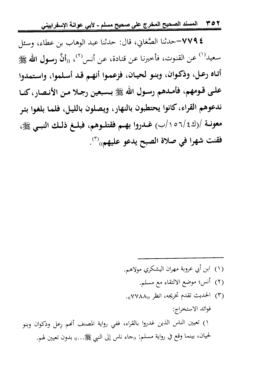 7794 - حدثنا الصَّغاني، قال: حدثنا عبد الوهاب بن عطاء، وسئل سعيد (¬1) عن القنوت، فأخبرنا عن قتادة، عن أنس (¬2)، "أنَّ رسول الله -صلى الله عليه وسلم- أتاه رعل، وذكوان، وبنو لحيان، فزعموا أنهم قد أسلموا، واستمدوا على قومهم، فأمدهم رسول الله -صلى الله عليه وسلم- بسبعين رجلا من الأنصار، كنا ندعوهم القراء، كانوا يحتطبون بالنهار، ويصلون بالليل، فلما بلغوا بئر معونة غدروا بهم فقتلوهم، فبلغ ذلك النبي -صلى الله عليه وسلم-، فقنت شهرا في صلاة الصبح يدعو عليهم" (¬3).