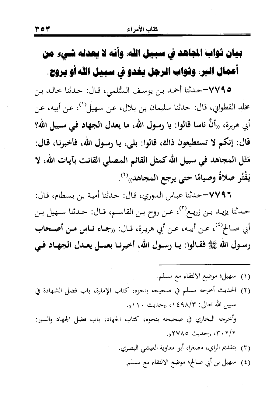 7795 - حدثنا أحمد بن يوسف السُّلمي، قال: حدثنا خالد بن مخلد القطواني، قال: حدثنا سليمان بن بلال، عن سهيل (¬1)، عن أبيه، عن أبي هريرة، "أنَّ ناسا قالوا: يا رسول الله، ما يعدل الجهاد في سبيل الله؟ قال: إنكم لا تستطيعون ذاك، قالوا: بلى، يا رسول الله، فأخبرنا، قال: مَثَل المجاهد في سبيل الله كمثل القائم المصلي القانت بآيات الله، لا يَفْتُر صلاةً وصيامًا حتى يرجع المجاهد" (¬2).