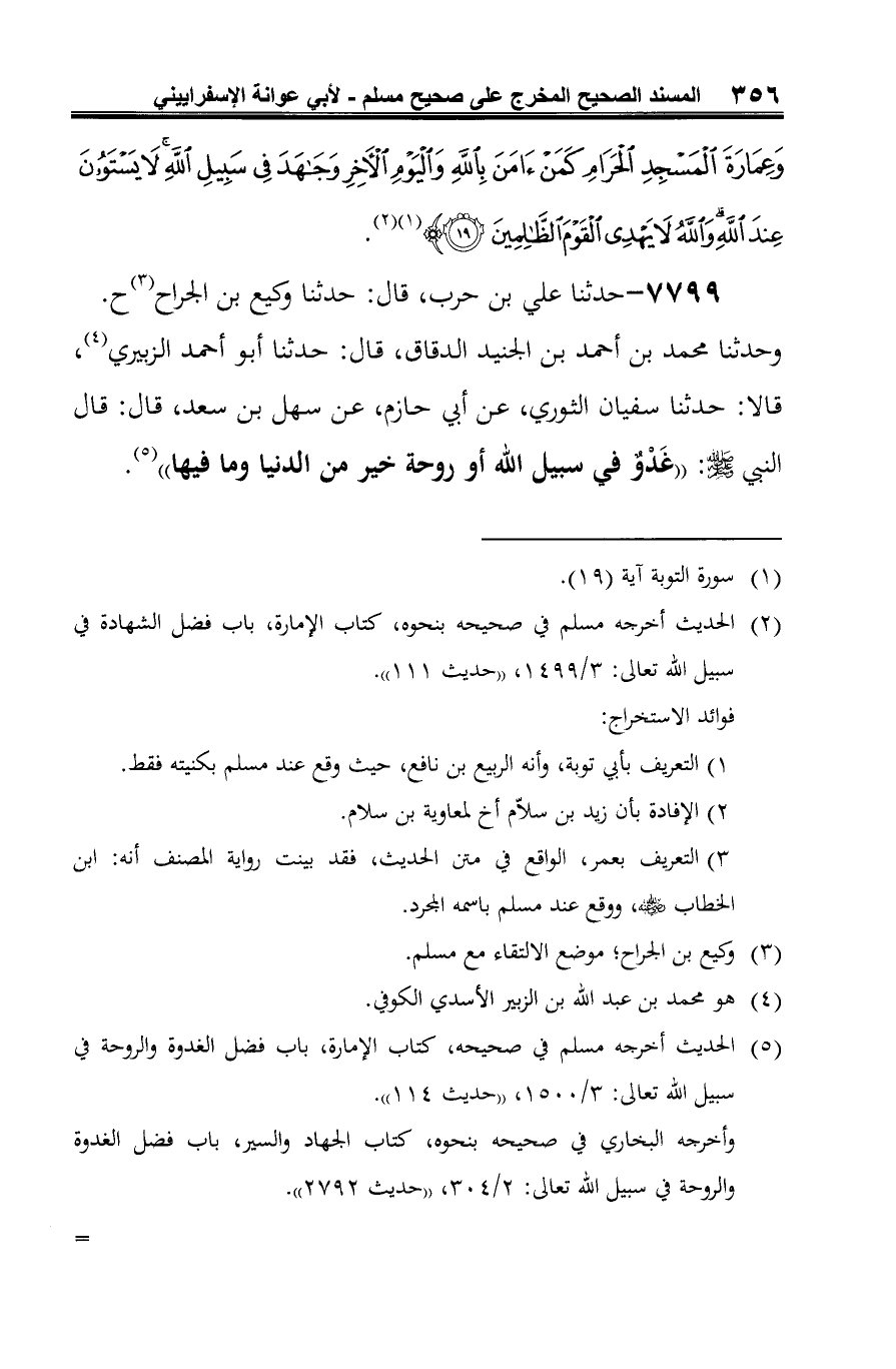 (¬3) الحديث أخرجه مسلم في صحيحه، كتاب الإمارة، باب فضل الغدوة والروحة في سبيل الله تعالى: 3/ 1500، "حديث 114".