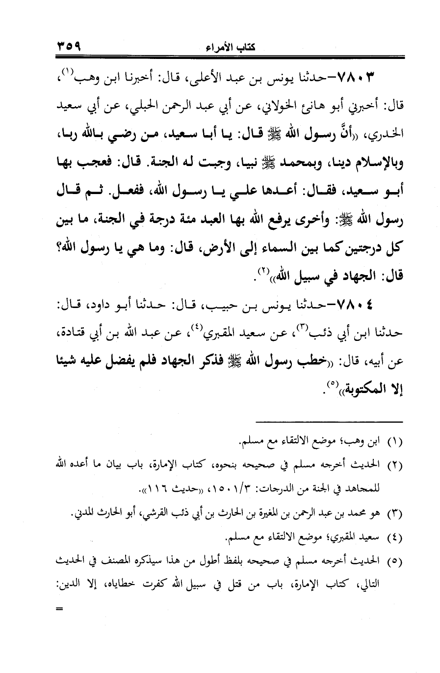 7803 - حدثنا يونس بن عبد الأعلى، قال: أخبرنا ابن وهب (¬1)، قال: أخبرني أَبو هانئ الخولاني، عن أبي عبد الرحمن الحبلي، عن أبي سعيد الخدري، "أنَّ رسول الله -صلى الله عليه وسلم- قال: يا أبا سعيد، من رضي بالله ربا، وبالإسلام دينا، وبمحمد -صلى الله عليه وسلم- نبيا، وجبت له الجنة. قال: فعجب بها أَبو سعيد، فقال: أعدها علي يا رسول الله، ففعل. ثم قال رسول الله -صلى الله عليه وسلم-: وأخرى يرفع الله بها العبد مئة درجة في الجنة، ما بين كل درجتين كما بين السماء إلى الأرض، قال: وما هي يا رسول الله؟ قال: الجهاد في سبيل الله" (¬2).