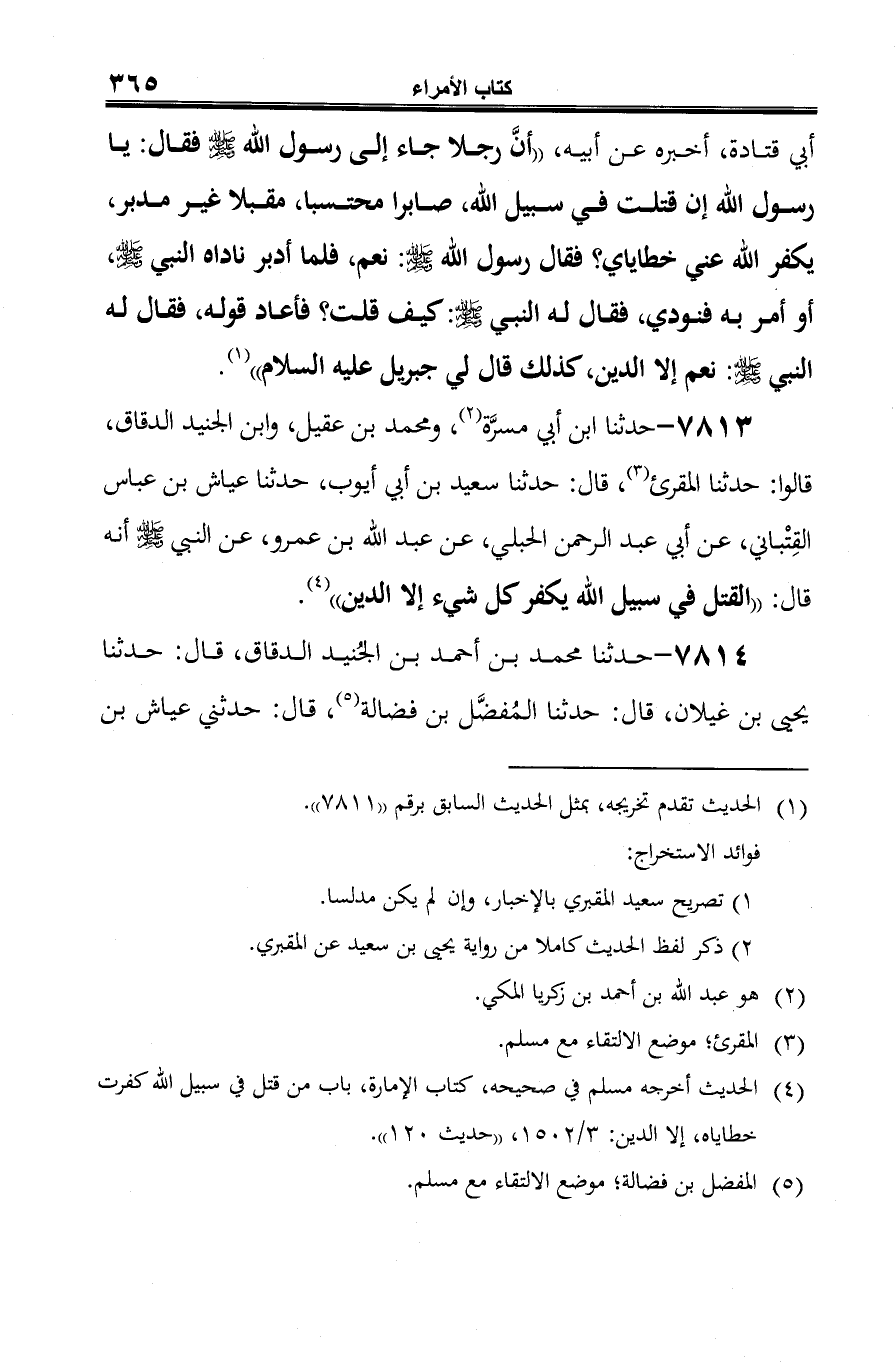 7813 - حدثنا ابن أبي مسرَّة (¬1)، ومحمد بن عقيل، وابن الجنيد الدقاق، قالوا: حدثنا المقرئ (¬2)، قال: حدثنا سعيد بن أبي أيوب، حدثنا عياش بن عباس القِتْباني، عن أبي عبد الرحمن الحبلي، عن عبد الله بن عمرو، عن النبي -صلى الله عليه وسلم- أنه قال: "القتل في سبيل الله يكفر كل شيء إلا الدين" (¬3).