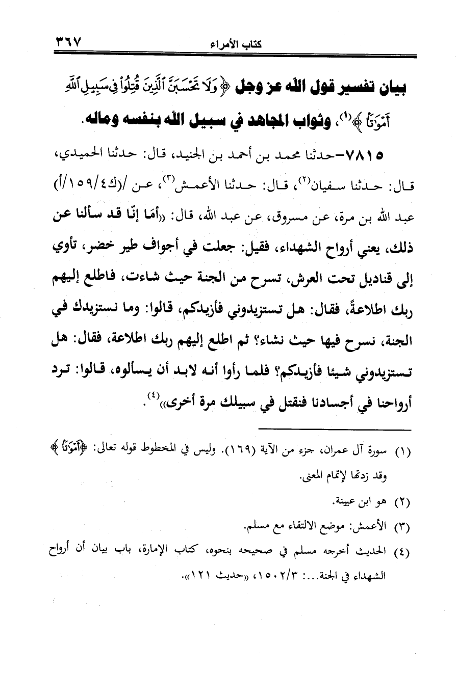7815 - حدثنا محمد بن أحمد بن الجنيد، قال: حدثنا الحميدي، قال: حدثنا سفيان (¬1)، قال: حدثنا الأعمش (¬2)، عن عبد الله بن مرة، عن مسروق، عن عبد الله، قال: "أمَا إنّا قد سألنا عن ذلك، يعني أرواح الشهداء، فقيل: جعلت في أجواف طير خضر، تأوي إلى قناديل تحت العرش، تسرح من الجنة حيث شاءت، فاطلع إليهم ربك اطلاعةً، فقال: هل تستزيدوني فأزيدكم، قالوا: وما نستزيدك في الجنة، نسرح فيها حيث نشاء؟ ثم اطلع إليهم ربك اطلاعة، فقال: هل تستزيدوني شيئا فأزيدكم؟ فلما رأوا أنه لابد أن يسألوه، قالوا: ترد أرواحنا في أجسادنا فنقتل في سبيلك مرة أخرى" (¬3).