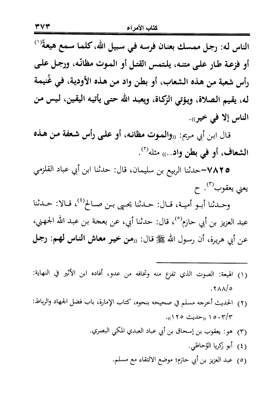 -[374]- ممسك بعنان فرسه في سبيل الله يطير على متنه، كلما سمع هَيْعة أو فزعة طار عليه، يبتغي القتل أو الموت في مظانه، أو رجل في غنيمة في رأس شعفة من هذه الشعاف. وقال ابن أبي عباد: في شعبة من هذه الشعاب، أو بطن واد من هذه الأودية، يقيم الصلاة ويؤتي الزكاة ويعبد ربه حتى يأتيه اليقين". زاد أَبو أمية: "ليس من الناس إلا في خير" (¬4).
