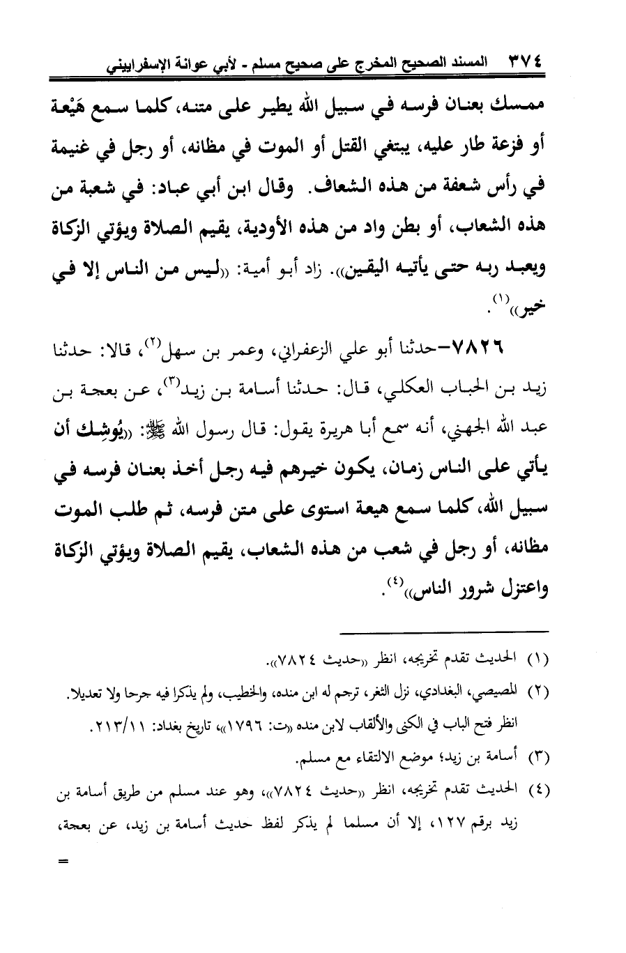 7826 - حدثنا أَبو علي الزعفراني، وعمر بن سهل (¬1)، قالا: حدثنا زيد بن الحباب العكلي، قال: حدثنا أسامة بن زيد (¬2)، عن بعجة بن عبد الله الجهني، أنه سمع أبا هريرة يقول: قال رسول الله -صلى الله عليه وسلم-: "يُوشِك أن يأتي على الناس زمان، يكون خيرهم فيه رجل أخذ بعنان فرسه في سبيل الله، كلما سمع هيعة استوى على متن فرسه، ثم طلب الموت مظانه، أو رجل في شعب من هذه الشعاب، يقيم الصلاة ويؤتي الزكاة واعتزل شرور الناس" (¬3).