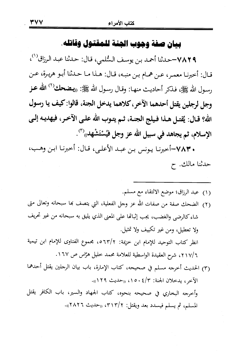 7829 - حدثنا أحمد بن يوسف السُّلمي، قال: حدثنا عبد الرزاق (¬1)، قال: أخبرنا معمر، عن همام بن منبه، قال: هذا ما حدثنا أَبو هريرة، عن رسول الله -صلى الله عليه وسلم-، فذكر أحاديث منها: وقال رسول الله -صلى الله عليه وسلم-: "يضحك (¬2) الله عز وجل لرجلين يقتل أحدهما الآخر، كلاهما يدخل الجنة، قالوا: كيف يا رسول الله؟ قال: يُقتل هذا فيلج الجنة، ثم يتوب الله على الآخر، فيهديه إلى الإسلام، ثم يجاهد في سبيل الله عز وجل فيُسْتَشْهد" (¬3).