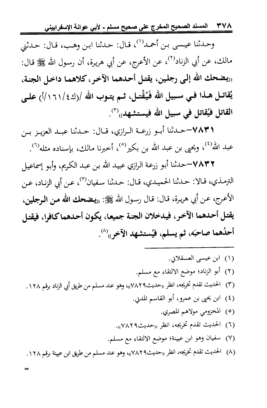 7832 - حدثنا أَبو زرعة الرازي عبيد الله بن عبد الكريم، وأبو إسماعيل الترمذي، قالا: حدثنا الحميدي، قال: حدثنا سفيان (¬1)، عن أبي الزناد، عن الأعرج، عن أبي هريرة، قال: قال رسول الله -صلى الله عليه وسلم-: "يضحك الله من الرجلين، يقتل أحدهما الآخر، فيدخلان الجنة جميعا، يكون أحدهما كافرا، فيقتل أحدُهما صاحبَه، ثم يسلم، فيُستشهد الآخر" (¬2).