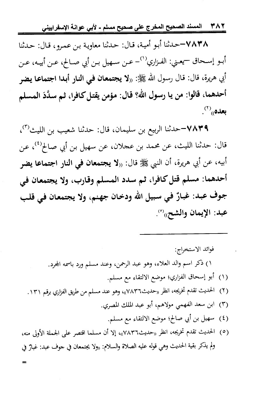 7838 - حدثنا أَبو أمية، قال: حدثنا معاوية بن عمرو، قال: حدثنا أَبو إسحاق-يعني: الفزاري (¬1) - عن سهيل بن أبي صالح، عن أبيه، عن أبي هريرة، قال: قال رسول الله -صلى الله عليه وسلم-: "لا يجتمعان في النار أبدا اجتماعا يضر أحدهما، قالوا: من يا رسول الله؟ قال: مؤمن يقتل كافرا، ثم سدَّدَ المسلم بعده" (¬2).