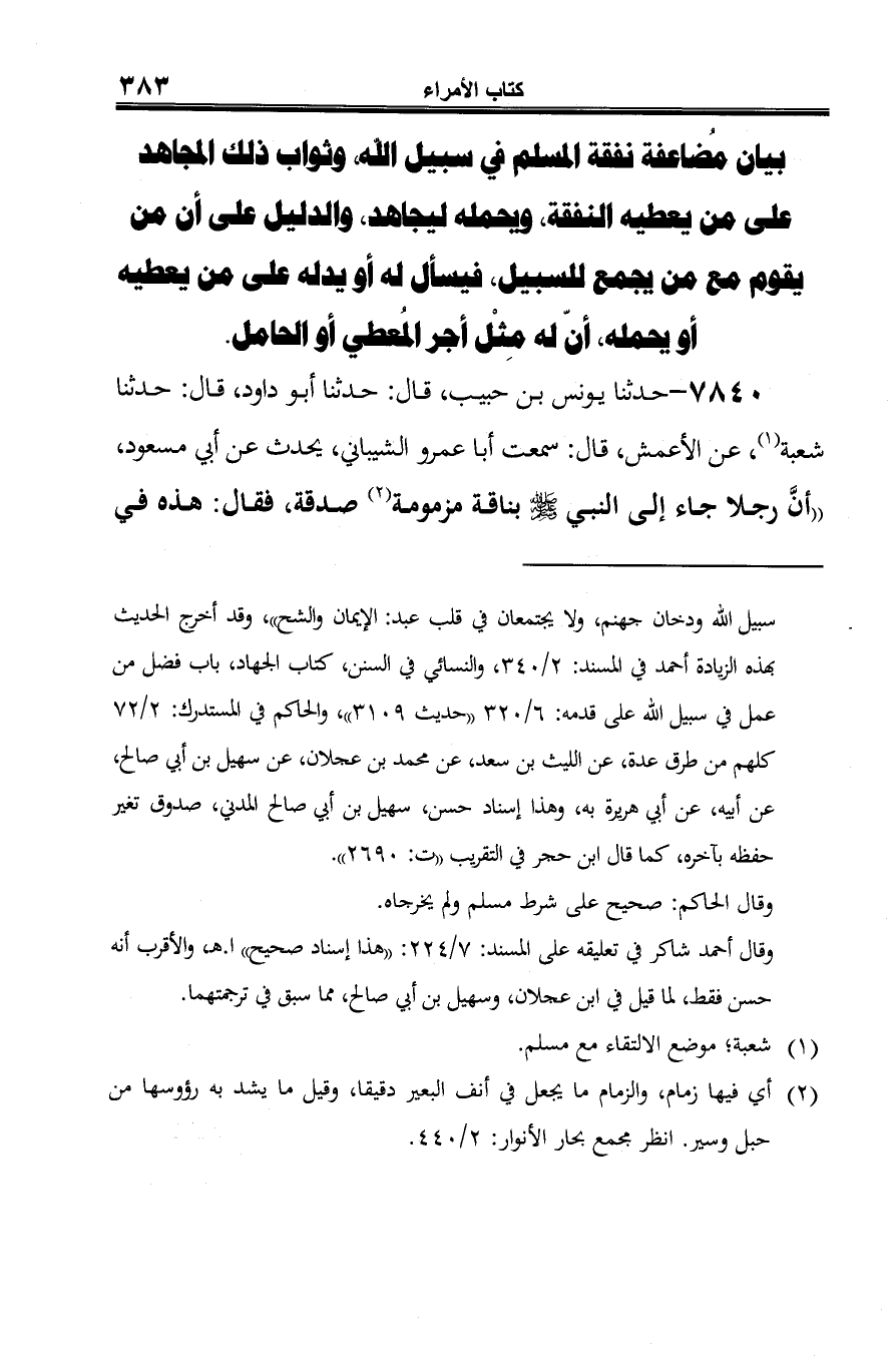 -[384]- سبيل الله، فقال رسول الله -صلى الله عليه وسلم-: ولك بها يوم القيامة سبعمئة ناقة مزمومة" (¬3).