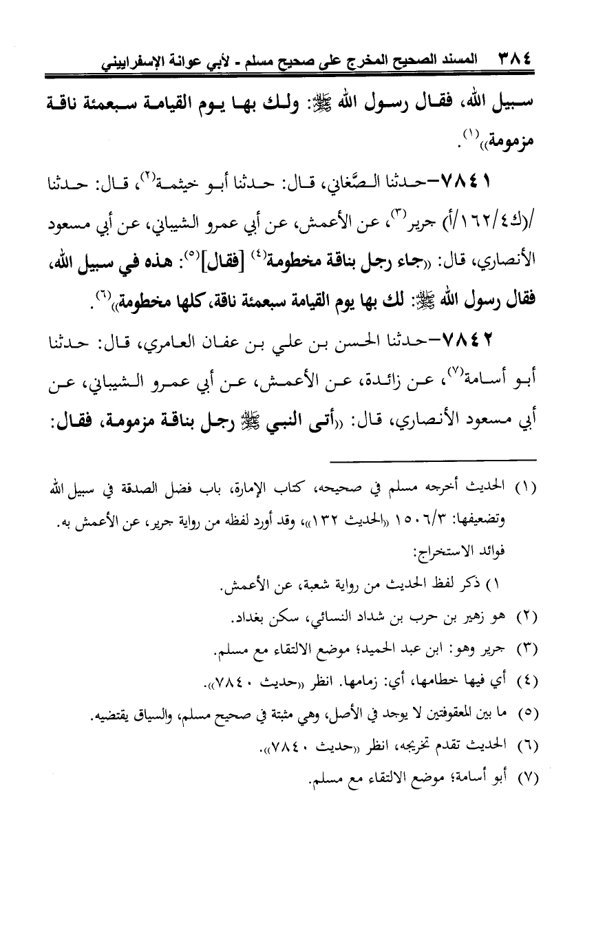 7841 - حدثنا الصَّغاني، قال: حدثنا أَبو خيثمة (¬1)، قال: حدثنا جرير (¬2)، عن الأعمش، عن أبي عمرو الشيباني، عن أبي مسعود الأنصاري، قال: "جاء رجل بناقة مخطومة (¬3) [فقال] (¬4): هذه في سبيل الله، فقال رسول الله -صلى الله عليه وسلم-: لك بها يوم القيامة سبعمئة ناقة، كلها مخطومة" (¬5).