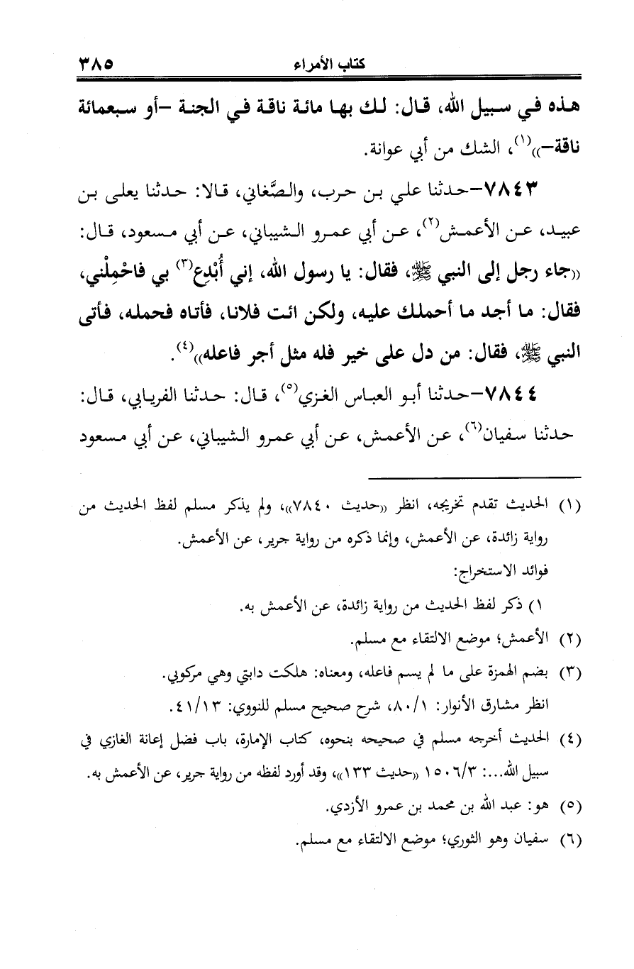 7843 - حدثنا علي بن حرب، والصَّغاني، قالا: حدثنا يعلى بن عبيد، عن الأعمش (¬1)، عن أبي عمرو الشيباني، عن أبي مسعود، قال: "جاء رجل إلى النبي -صلى الله عليه وسلم-، فقال: يا رسول الله، إني أُبْدِع (¬2) بي فاحْمِلْني، فقال: ما أجد ما أحملك عليه، ولكن ائت فلانا، فأتاه فحمله، فأتى النبي -صلى الله عليه وسلم-، فقال: من دل على خير فله مثل أجر فاعله" (¬3).