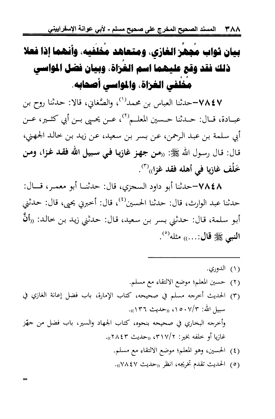 (¬3) الحديث أخرجه مسلم في صحيحه، كتاب الإمارة، باب فضل إعانة الغازي في سبيل الله: 3/ 1507، "حديث 136".