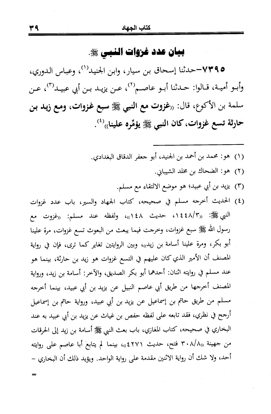 7395 - حدثنا إسحاق بن سيار، وابن الجنيد (¬1)، وعباس الدوري، وأبو أمية، قالوا: حدثنا أبو عاصم (¬2)، عن يزيد بن أبي عبيد (¬3)، عن سلمة بن الأكوع، قال: "غزوت مع النبي -صلى الله عليه وسلم- سبع غزوات، ومع زيد بن حارثة تسع غزوات، كان النبي -صلى الله عليه وسلم- يؤمِّره علينا" (¬4).