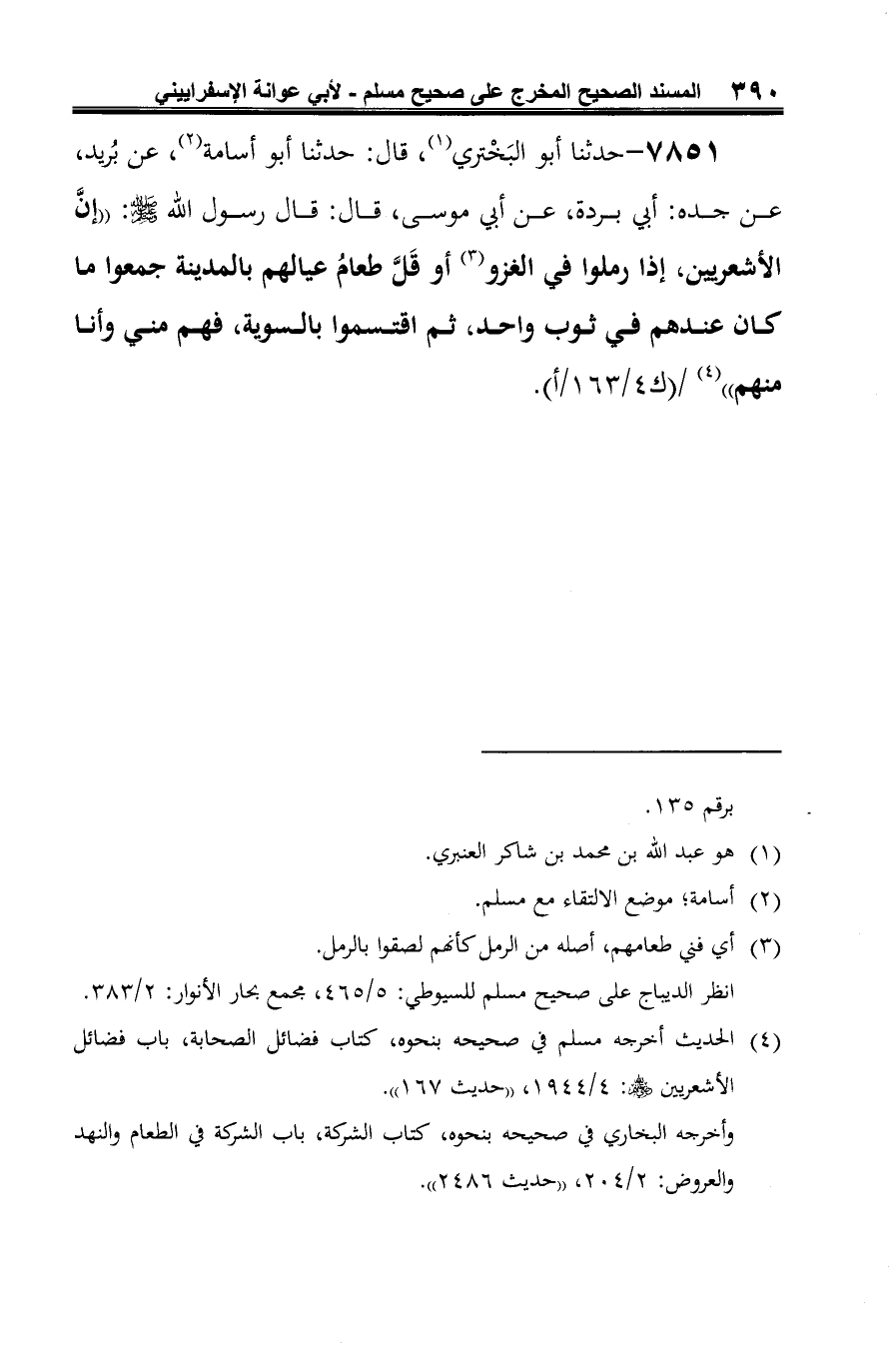 (¬4) الحديث أخرجه مسلم في صحيحه بنحوه، كتاب فضائل الصحابة، باب فضائل الأشعريين -رضي الله عنهم-: 4/ 1944، "حديث 167".