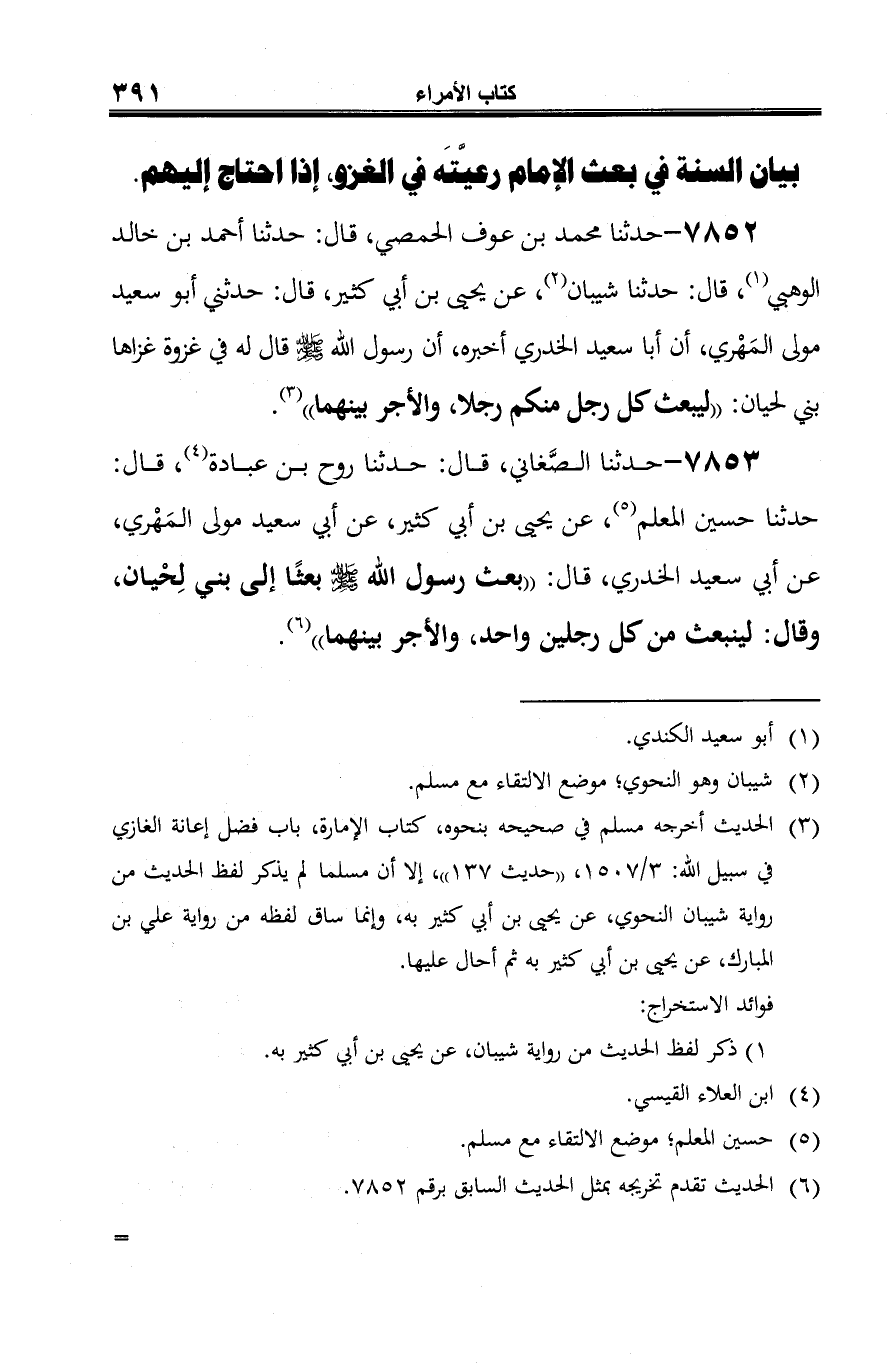 7852 - حدثنا محمد بن عوف الحمصي، قال: حدثنا أحمد بن خالد الوهبي (¬1)، قال: حدثنا شيبان (¬2)، عن يحيى بن أبي كثير، قال: حدثني أَبو سعيد مولى المَهْري، أن أبا سعيد الخدري أخبره، أن رسول الله -صلى الله عليه وسلم- قال له في غزوة غزاها بني لحيان: "ليبعث كل رجل منكم رجلا، والأجر بينهما" (¬3).