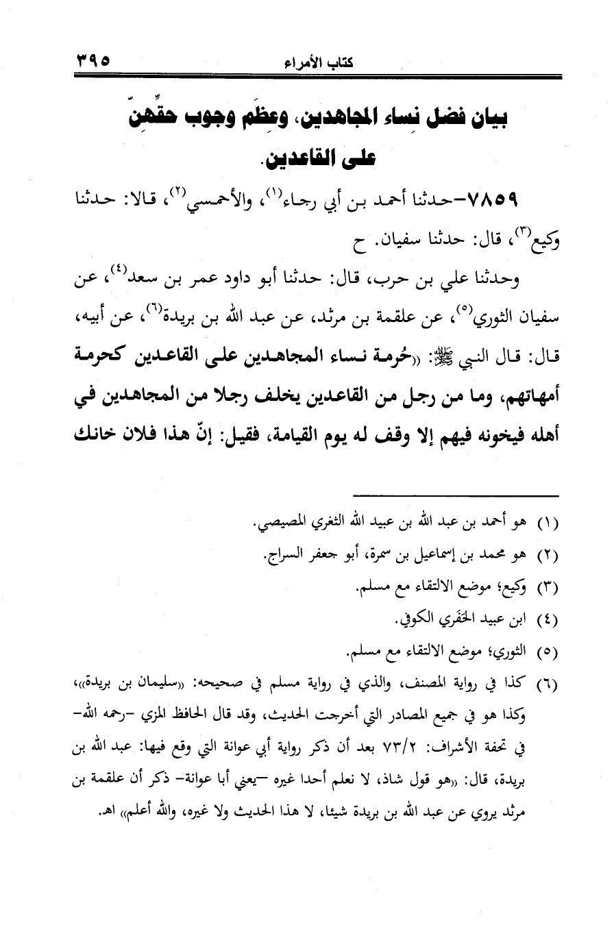 وحدثنا علي بن حرب، قال: حدثنا أَبو داود عمر بن سعد (¬4)، عن سفيان الثوري (¬5)، عن علقمة بن مرثد، عن عبد الله بن بريدة (¬6)، عن أبيه، قال: قال النبي -صلى الله عليه وسلم-: "حُرمة نساء المجاهدين على القاعدين كحرمة أمهاتهم، وما من رجل من القاعدين يخلف رجلا من المجاهدين في أهله فيخونه فيهم إلا وقف له يوم القيامة، فقيل: إنّ هذا فلان خانك