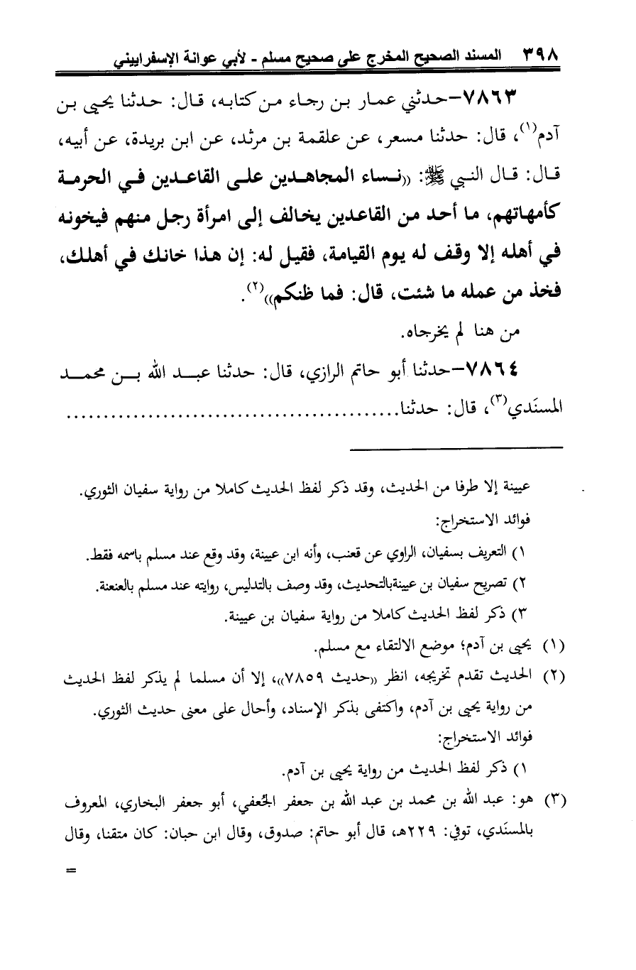 7863 - حدثني عمار بن رجاء من كتابه، قال: حدثنا يحيى بن آدم (¬1)، قال: حدثنا مسعر، عن علقمة بن مرثد، عن ابن بريدة، عن أبيه، قال: قال النبي -صلى الله عليه وسلم-: "نساء المجاهدين على القاعدين في الحرمة كأمهاتهم، ما أحد من القاعدين يخالف إلى امرأة رجل منهم فيخونه في أهله إلا وقف له يوم القيامة، فقيل له: إن هذا خانك في أهلك، فخذ من عمله ما شئت، قال: فما ظنكم" (¬2).
