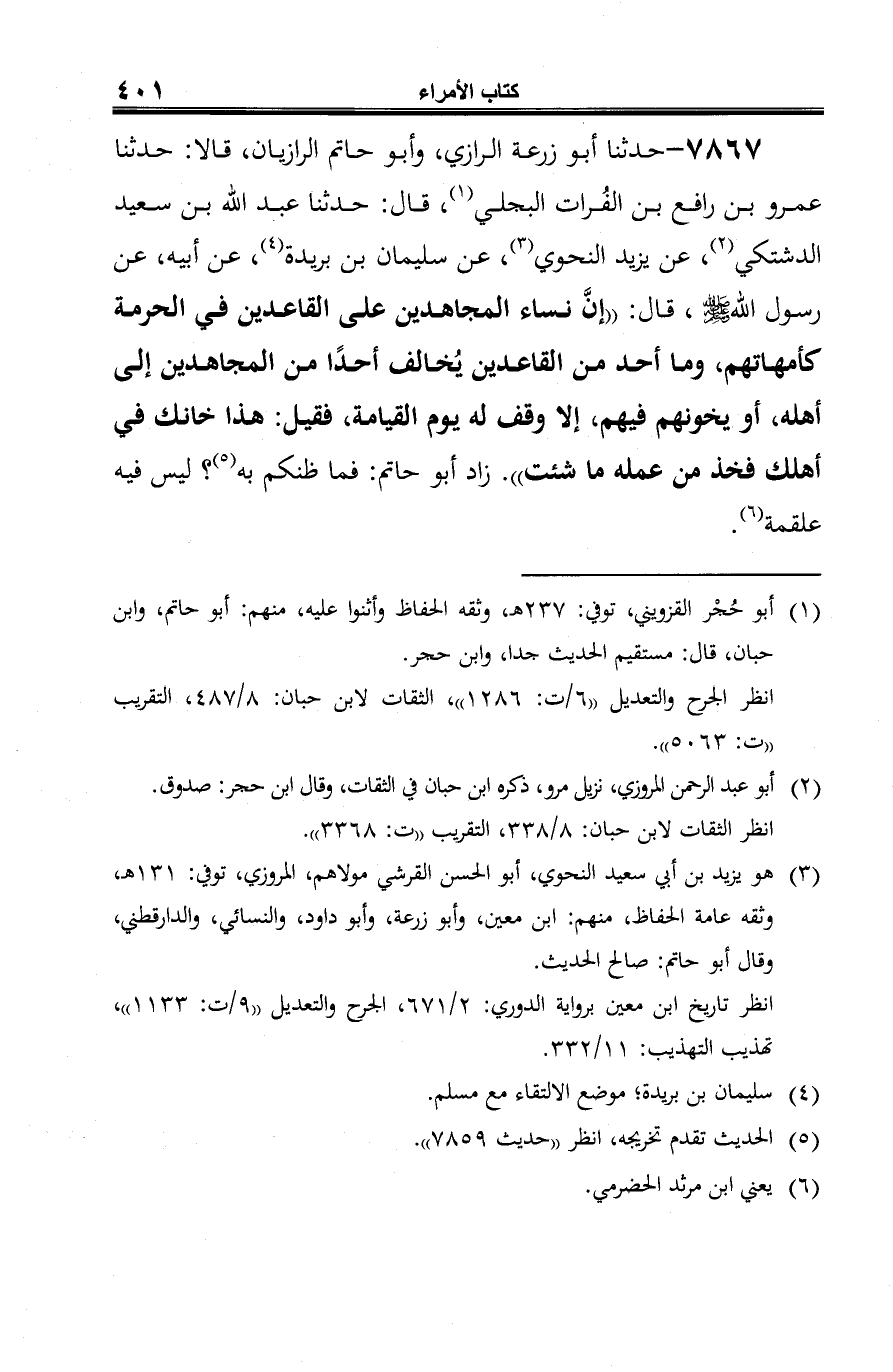 7867 - حدثنا أبو زرعة الرازي، وأبو حاتم الرازيان، قالا: حدثنا عمرو بن رافع بن الفُرات البجلي (¬1)، قال: حدثنا عبد الله بن سعيد الدشتكي (¬2)، عن يزيد النحوي (¬3)، عن سليمان بن بريدة (¬4)، عن أبيه، عن رسول الله -صلى الله عليه وسلم-، قال: "إنَّ نساء المجاهدين على القاعدين في الحرمة كأمهاتهم، وما أحد من القاعدين يُخالف أحدًا من المجاهدين إلى أهله، أو يخونهم فيهم، إلا وقف له يوم القيامة، فقيل: هذا خانك في أهلك فخذ من عمله ما شئت". زاد أبو حاتم: فما ظنكم به (¬5)؟ ليس فيه علقمة (¬6).