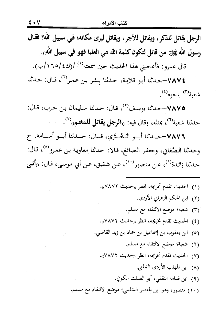 7875 - حدثنا يوسف (¬1)، قال: حدثنا سليمان بن حرب، قال: حدثنا شعبة (¬2)، بمثله، وقال فيه: "الرجل يقاتل للمغنم" (¬3).