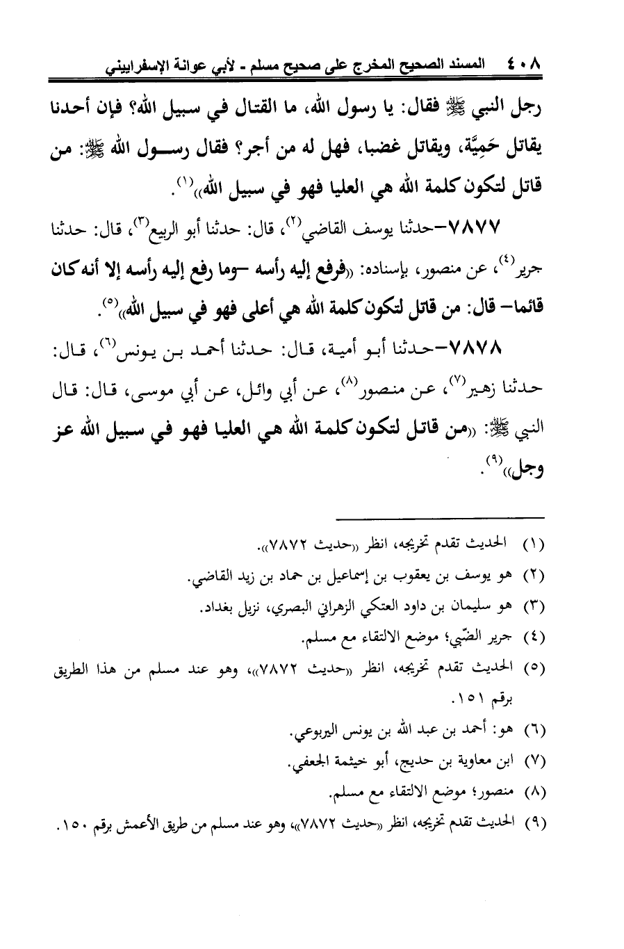 7877 - حدثنا يوسف القاضي (¬1)، قال: حدثنا أبو الربيع (¬2)، قال: حدثنا جرير (¬3)، عن منصور، بإسناده: "فرفع إليه رأسه -وما رفع إليه رأسه إلا أنه كان قائما- قال: من قاتل لتكون كلمة الله هي أعلى فهو في سبيل الله" (¬4).