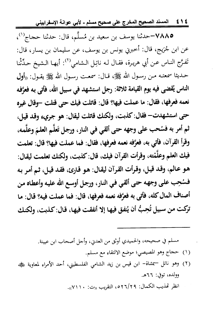 7885 - حدثنا يوسف بن سعيد بن مُسلَّم، قال: حدثنا حجاج (¬1)، عن ابن جُرَيج، قال: أخبرني يونس بن يوسف، عن سليمان بن يسار، قال: تَفرَّج الناس عن أبي هريرة، فقال له ناتِل الشامي (¬2): أيها الشيخ حدِّثْنا حديثا سمعته من رسول الله -صلى الله عليه وسلم-، قال: سمعت رسول الله -صلى الله عليه وسلم- يقول: "أول الناس يُقضى فيه يوم القيامة ثلاثة: رجل استشهد في سبيل الله، فأتى به فعرَّفه نعمه فعرفها، فقال: ما عملت فيها؟ قال: قاتلت فيك حتى قتلت -وقال غيره حتى استشهدت- فقال: كذبت، ولكنك قاتلت ليقال: هو جريء وقد قيل، ثم أمر به فسُحب على وجهه حتى ألقي في المنار، ورجل تَعلَّم العلمَ وعلَّمه، وقرأ القرآن، فأتي به، فعرَّفه نعمه فعرفها، فقال: فما عملت فيها؟ قال: تعلمت فيك العلم وعلَّمْته، وقرأت القرآن فيك، قال: كذبت، ولكنك تعلمت ليقال: هو عالم، وقد قيل، وقرأت القرآن ليقال: هو قارئ، فقد قيل، ثم أمر به فسُحِب على وجهه حتى ألقي في النار، ورجل أوسع الله عليه وأعطاه من أصناف المال كله، فأتى به فعرَّفه نعمه فعرفها، قال: فما عملت فيه؟ قال: ما تركت من سبيل تُحِبُّ أن يُنفق فيها إلا أنفقت فيها، قال: كذبت، ولكنك
