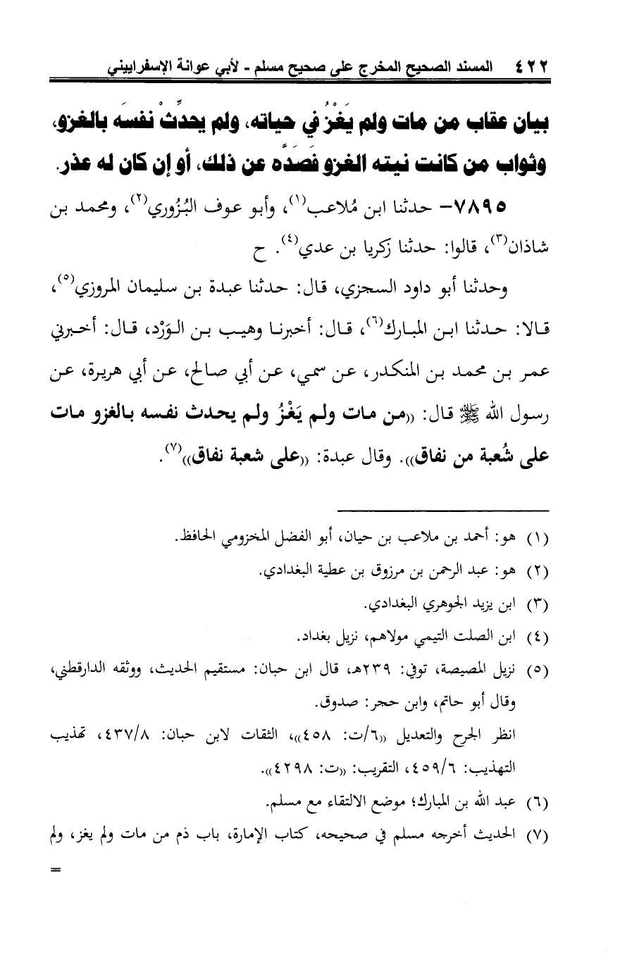 وحدثنا أبو داود السجزي، قال: حدثنا عبدة بن سليمان المروزي (¬5)، قالا: حدثنا ابن المبارك (¬6)، قال: أخبرنا وهيب بن الوَرْد، قال: أخبرني عمر بن محمد بن المنكدر، عن سمي، عن أبي صالح، عن أبي هريرة، عن رسول الله -صلى الله عليه وسلم- قال: "من مات ولم يَغْزُ ولم يحدث نفسه بالغزو مات على شُعبة من نفاق". وقال عبدة: "على شعبة نفاق" (¬7).
