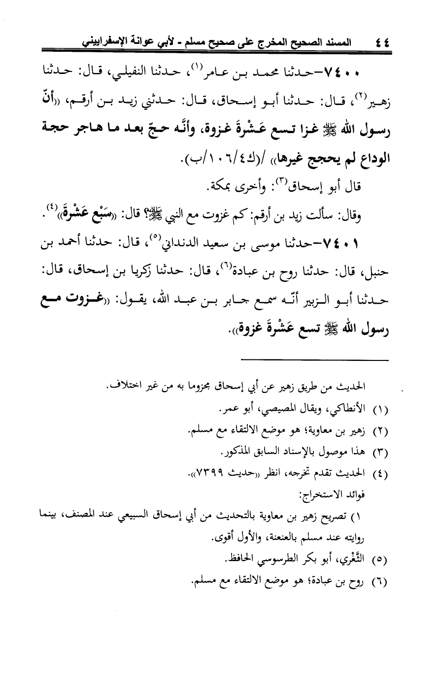7400 - حدثنا محمد بن عامر (¬1)، حدثنا النفيلي، قال: حدثنا زهير (¬2)، قال: حدثنا أبو إسحاق، قال: حدثني زيد بن أرقم، "أنّ رسول الله -صلى الله عليه وسلم- غزا تسع عَشْرةَ غزوة، وأنَّه حجّ بعد ما هاجر حجة الوداع لم يحجج غيرها".