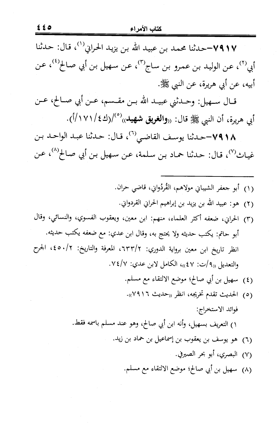 7917 - حدثنا محمد بن عبيد الله بن يزيد الحراني (¬1)، قال: حدثنا أبي (¬2)، عن الوليد بن عمرو بن ساج (¬3)، عن سهيل بن أبي صالح (¬4)، عن أبيه، عن أبي هريرة، عن النبي -صلى الله عليه وسلم-.