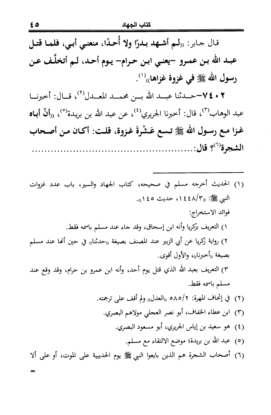 7402 - حدثنا عبد الله بن محمد المعدل (¬1)، قال: أخبرنا عبد الوهاب (¬2)، قال: أخبرنا الجريري (¬3)، عن عبد الله بن بريدة (¬4)، "أنّ أباه غزا مع رسول الله -صلى الله عليه وسلم- تسع عَشْرةَ غزوة، قلت: أكان من أصحاب الشجرة (¬5)؟ قال: