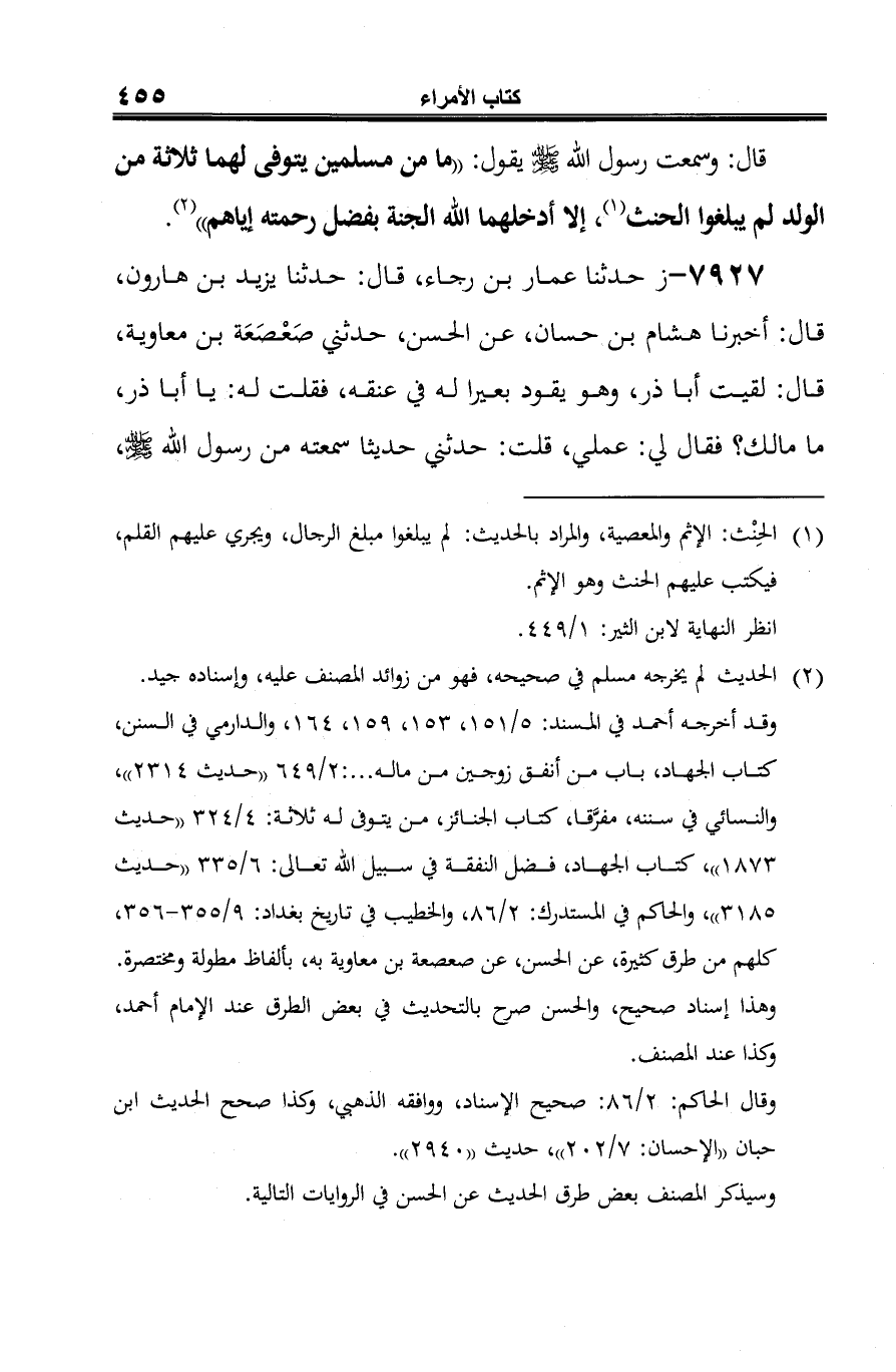 -[456]- قال: سمعت رسول الله -صلى الله عليه وسلم- يقول: "ما من مسلمين يموت لهما ثلاثة من الولد لم يبلغوا الحنث، إلا أدخلهما الجنة بفضل رحمته إياهم / (¬1)، وما من مسلم أنفق زوجين من ماله في سبيل الله إلا ابتدرته حجبة الجنة. قال هشام: وكان الحسن يقول: زوجين: درهمين، دينارين، اثنين من كل شيء" (¬2).