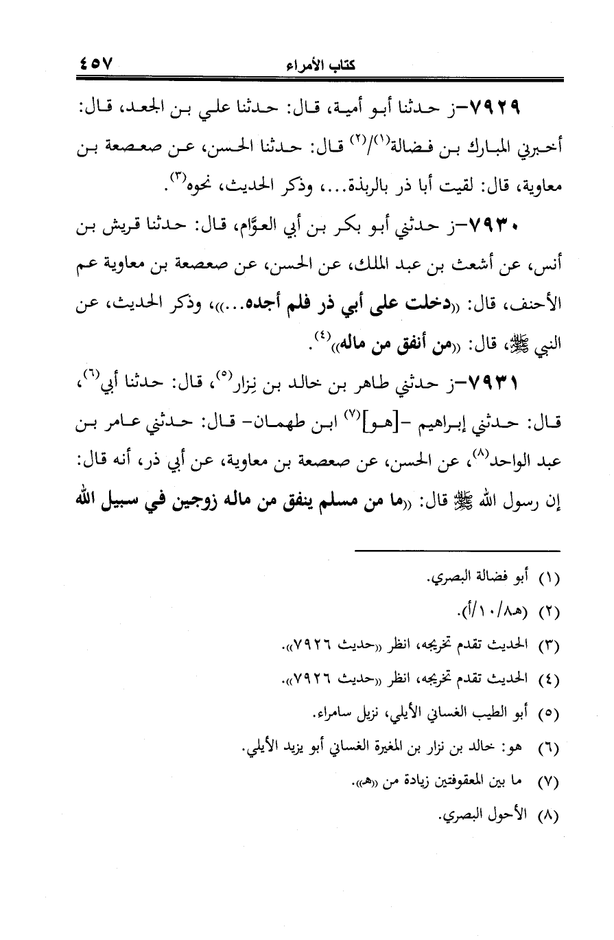 7931 - ز حدثني طاهر بن خالد بن نِزار (¬1)، قال: حدثنا أبي (¬2)، قال: حدثني إبراهيم -[هو] (¬3) ابن طهمان- قال: حدثني عامر بن عبد الواحد (¬4)، عن الحسن، عن صعصعة بن معاوية، عن أبي ذر، أنه قال: إن رسول الله -صلى الله عليه وسلم- قال: "ما من مسلم ينفق من ماله زوجين في سبيل الله