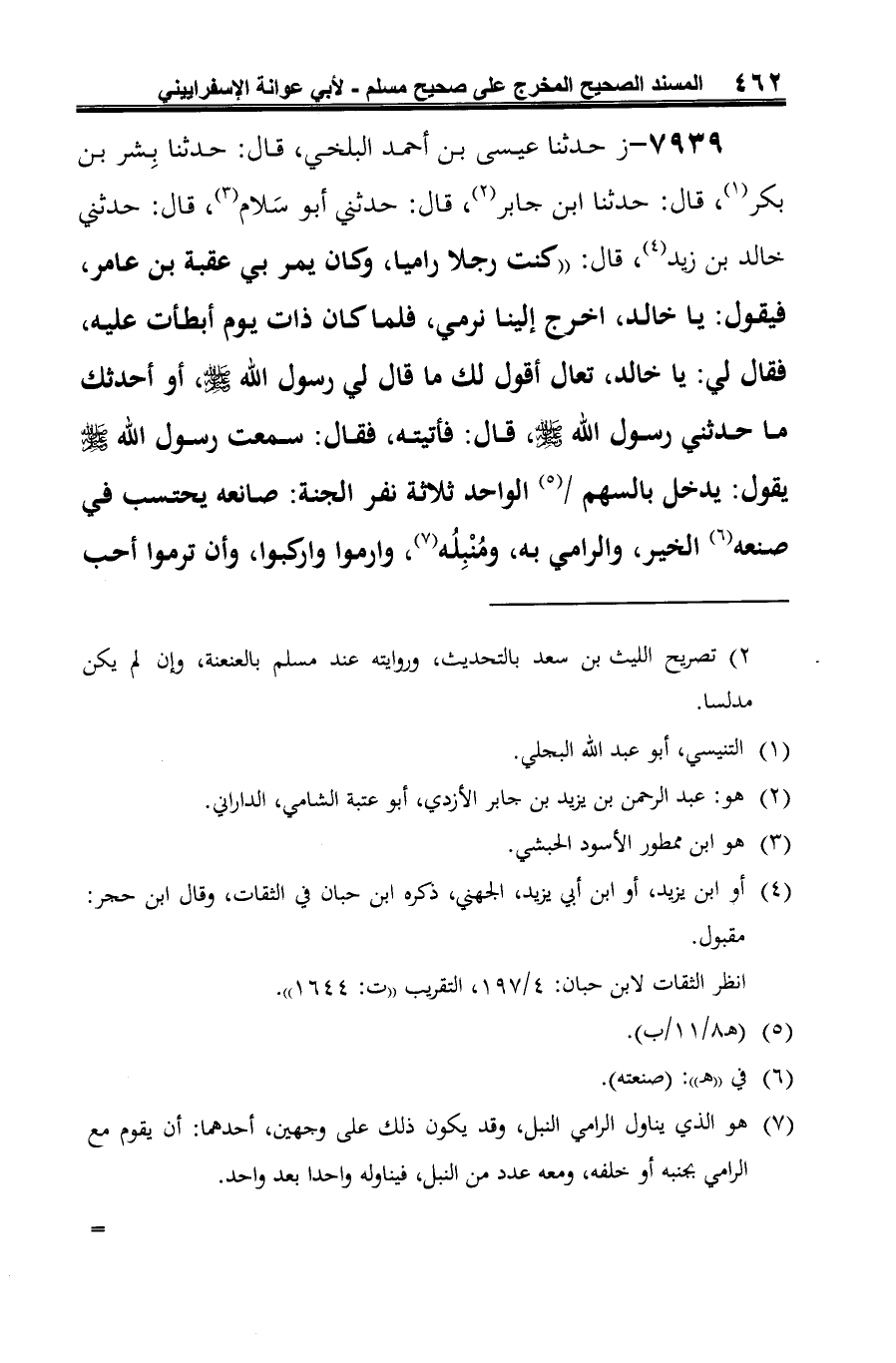 7939 - ز حدثنا عيسى بن أحمد البلخي، قال: حدثنا بِشر بن بكر (¬1)، قال: حدثنا ابن جابر (¬2)، قال: حدثني أَبو سَلام (¬3)، قال: حدثني خالد بن زيد (¬4)، قال: "كنت رجلا راميا، وكان يمر بي عقبة بن عامر، فيقول: يا خالد، اخرج إلينا نرمي، فلما كان ذات يوم أبطأت عليه، فقال لي: يا خالد، تعال أقول لك ما قال لي رسول الله -صلى الله عليه وسلم-، أو أحدثك ما حدثني رسول الله -صلى الله عليه وسلم-، قال: فأتيته، فقال: سمعت رسول الله -صلى الله عليه وسلم- يقول: يدخل بالسهم / (¬5) الواحد ثلاثة نفر الجنة: صانعه يحتسب في صنعه (¬6) الخير، والرامي به، ومُنْبِلُه (¬7)، وارموا واركبوا، وأن ترموا أحب