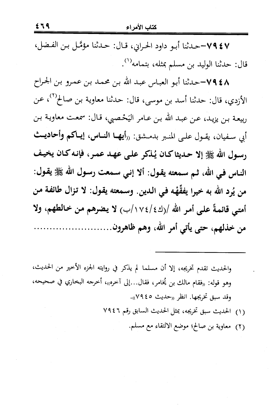 7948 - حدثنا أَبو العباس عبد الله بن محمد بن عمرو بن الجراح الأزدي، قال: حدثنا أسد بن موسى، قال: حدثنا معاوية بن صالح (¬1)، عن ربيعة بن يزيد، عن عبد الله بن عامر اليَحْصبي، قال: سمعت معاوية بن أبي سفيان، يقول على المنبر بدمشق: "أيها الناس، إياكم وأحاديث رسول الله -صلى الله عليه وسلم- إلا حديثا كان يُذكر على عهد عمر، فإنه كان يخيف الناس في الله، ثم سمعته يقول: ألا إني سمعت رسول الله -صلى الله عليه وسلم- يقول: من يُرد الله به خيرا يفقِّهْه في الدين. وسمعته يقول: لا تزال طائفة من أمتي قائمةً على أمر الله لا يضرهم من خالطهم، ولا من خذلهم، حتى يأتي أمر الله، وهم ظاهرون