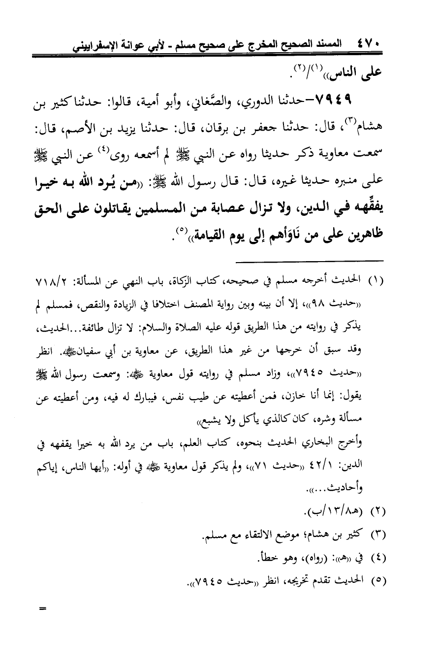 7949 - حدثنا الدوري، والصَّغاني، وأبو أمية، قالوا: حدثنا كثير بن هشام (¬1)، قال: حدثنا جعفر بن برقان، قال: حدثنا يزيد بن الأصم، قال: سمعت معاوية ذكر حديثا رواه عن النبي -صلى الله عليه وسلم- لم أسمعه روى (¬2) عن النبي -صلى الله عليه وسلم- على منبره حديثا غيره، قال: قال رسول الله -صلى الله عليه وسلم-: "من يُرد الله به خيرا يفقِّهه في الدين، ولا تزال عصابة من المسلمين يقاتلون على الحق ظاهرين على من نَاوَأهم إلى يوم القيامة" (¬3).