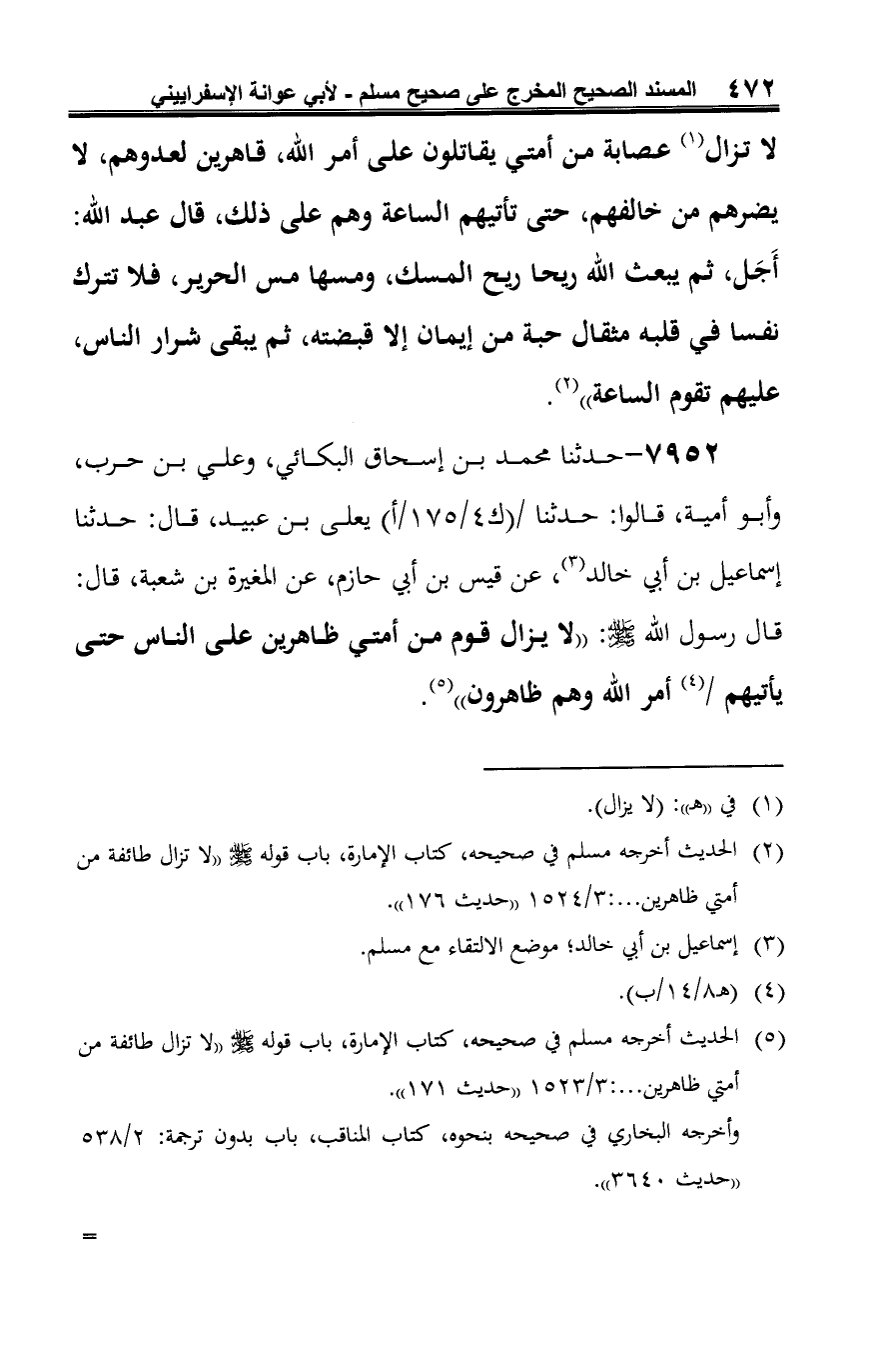7952 - حدثنا محمد بن إسحاق البكائي، وعلي بن حرب، وأبو أمية، قالوا: حدثنا يعلى بن عبيد، قال: حدثنا إسماعيل بن أبي خالد (¬1)، عن قيس بن أبي حازم، عن المغيرة بن شعبة، قال: قال رسول الله -صلى الله عليه وسلم-: "لا يزال قوم من أمتي ظاهرين على الناس حتى يأتيهم / (¬2) أمر الله وهم ظاهرون" (¬3).